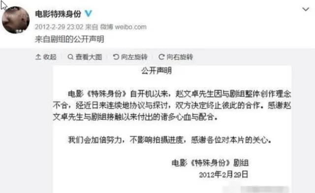 然而,电影开拍不久,剧组就发布公告,宣布与赵文卓终止合作,原因是 “创作理念不合”。