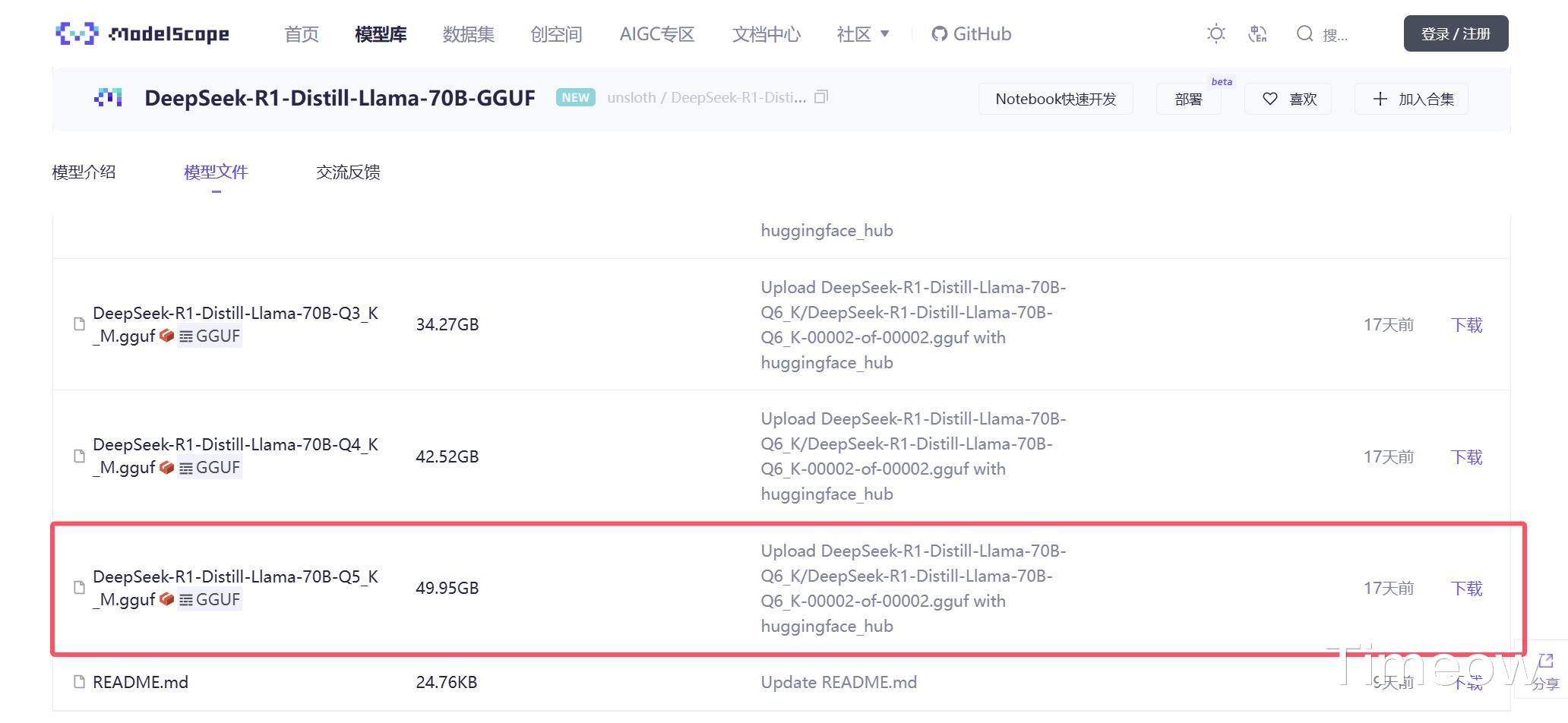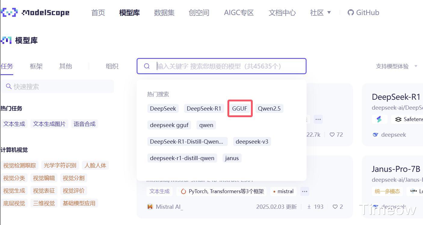 先去modelscope点cn搜索所需的DeepSeek模型,搜索的时候,加上关键词GGUF(ollama支持的模型文件格式)。