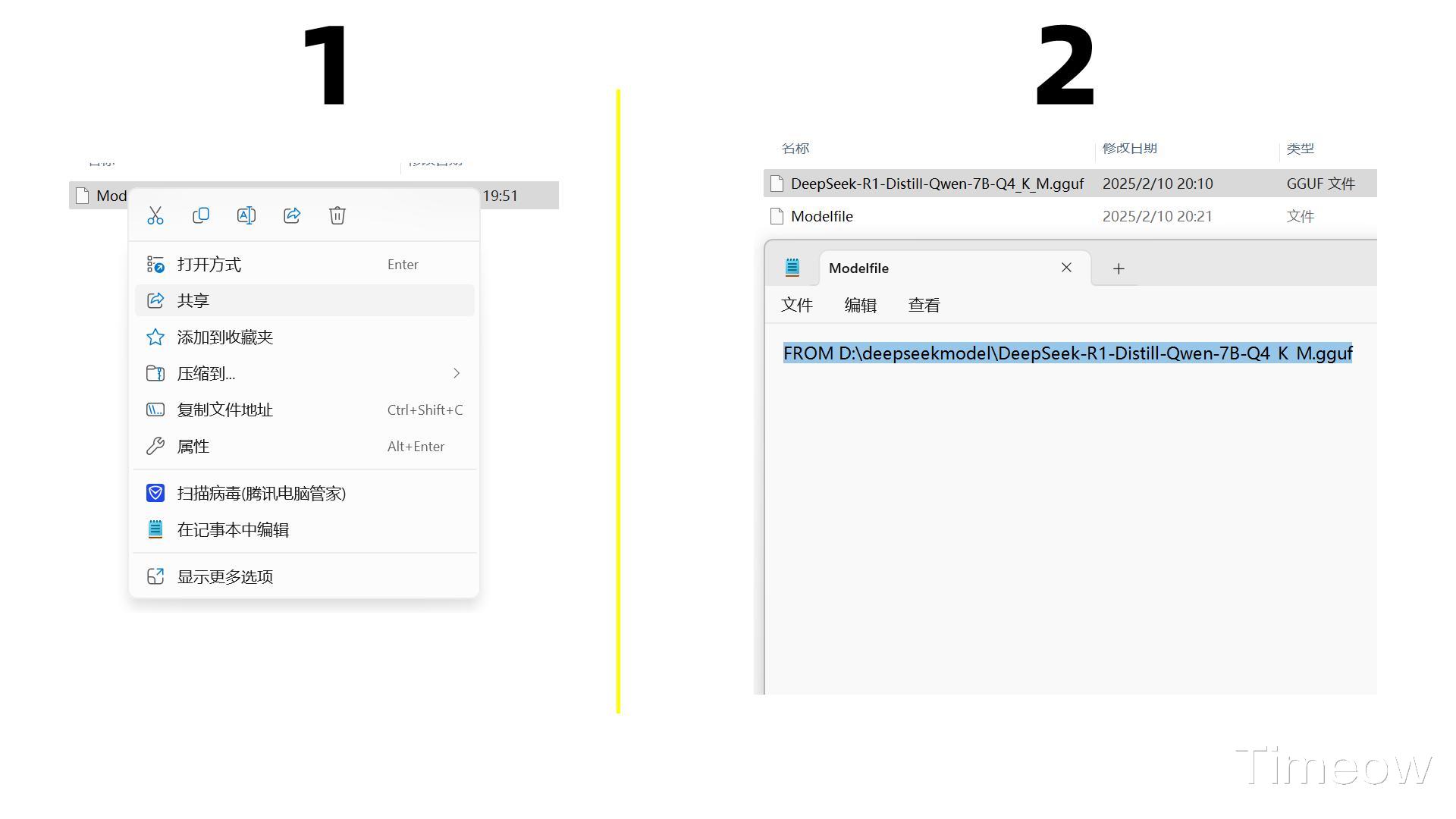 右键点击Modelfile,用记事本打开,输入以上图片内容FROM D:\deepseekmodel\DeepSeek-R1-Distill-Qwen-7B-Q4_K_M.gguf,并保存
