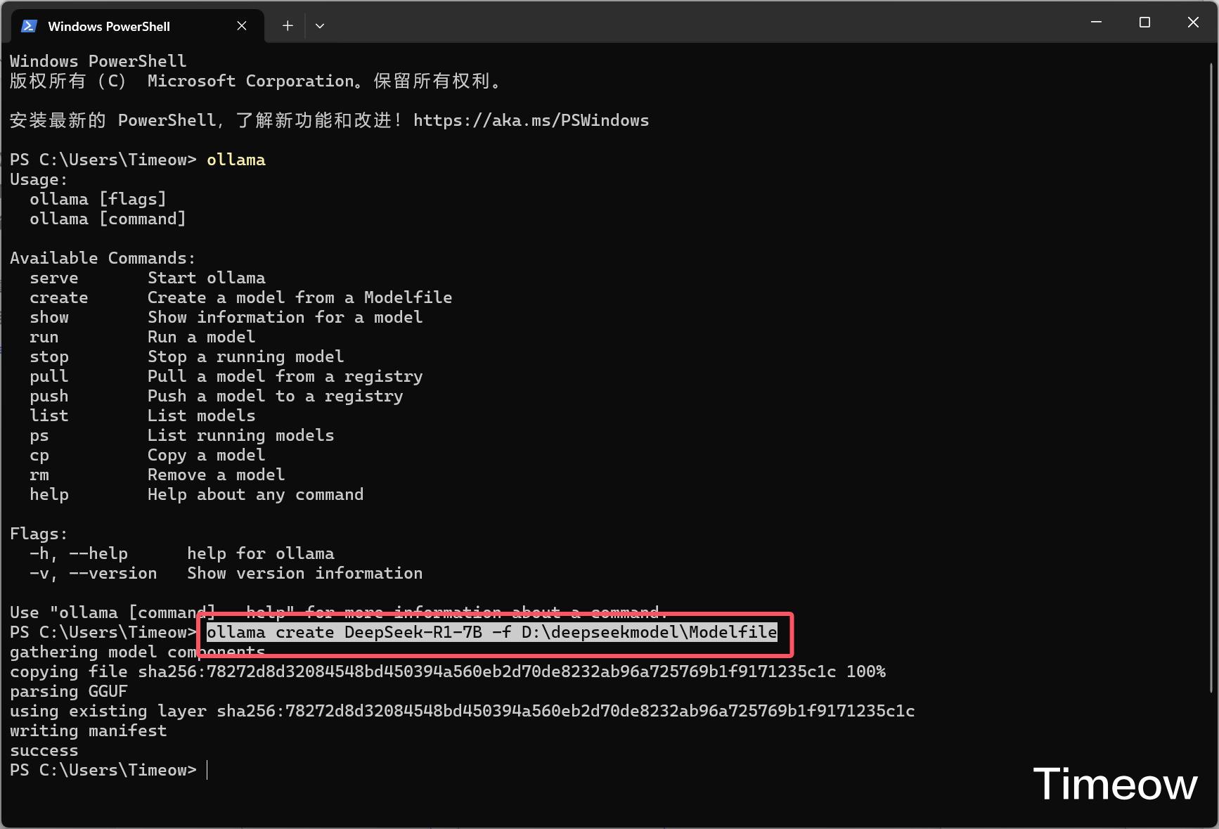 随后打开cmd/终端,输入ollama create DeepSeek-R1-7B -f D:\deepseekmodel\Modelfile