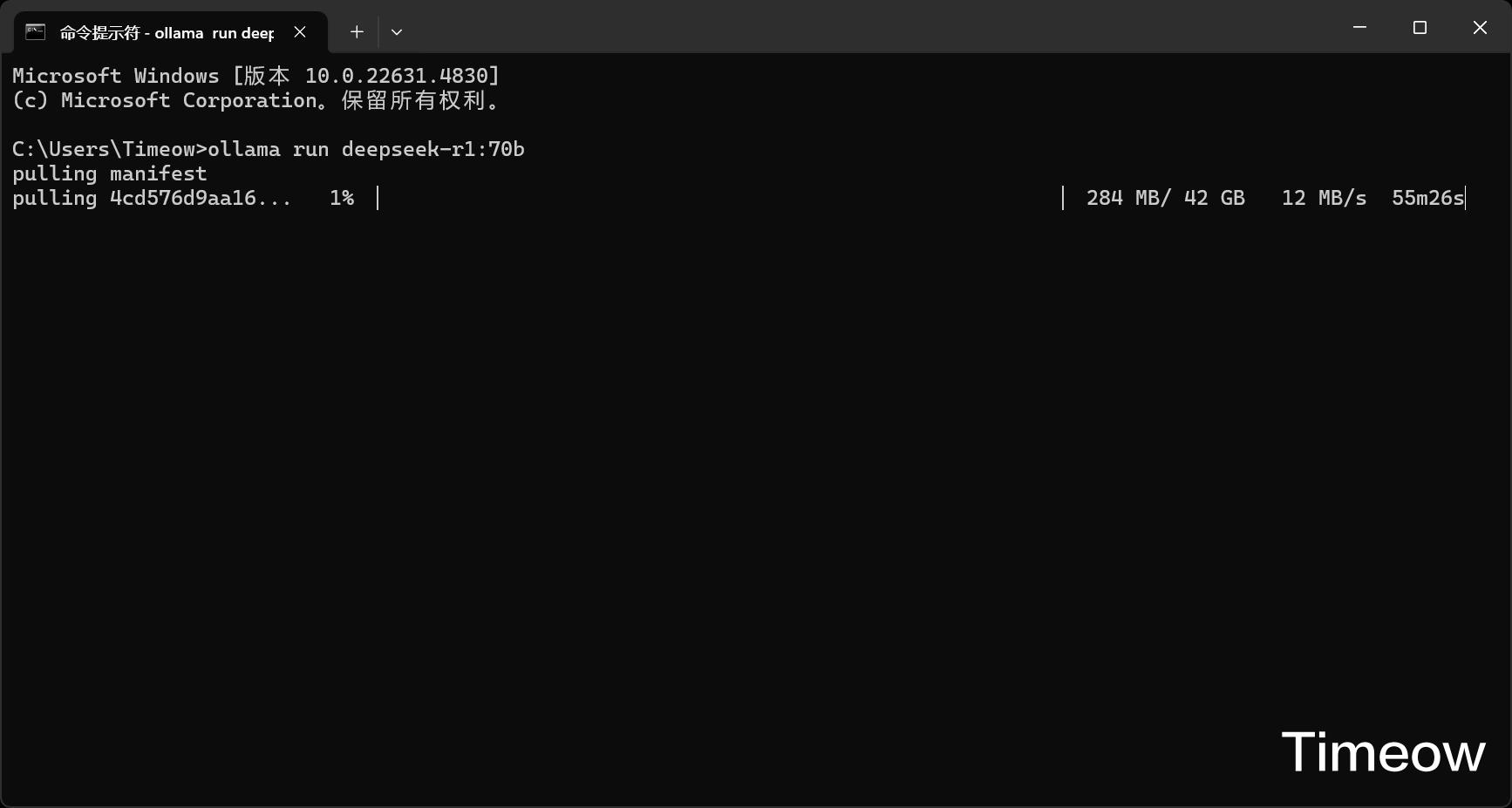 70b大模型的文件大小是42GB左右,克隆/下载速度因人而异,默认会安装在C盘。如何想要更改大模型的存储目录,请拖到文章后面的部分,我会教各位如何操作。