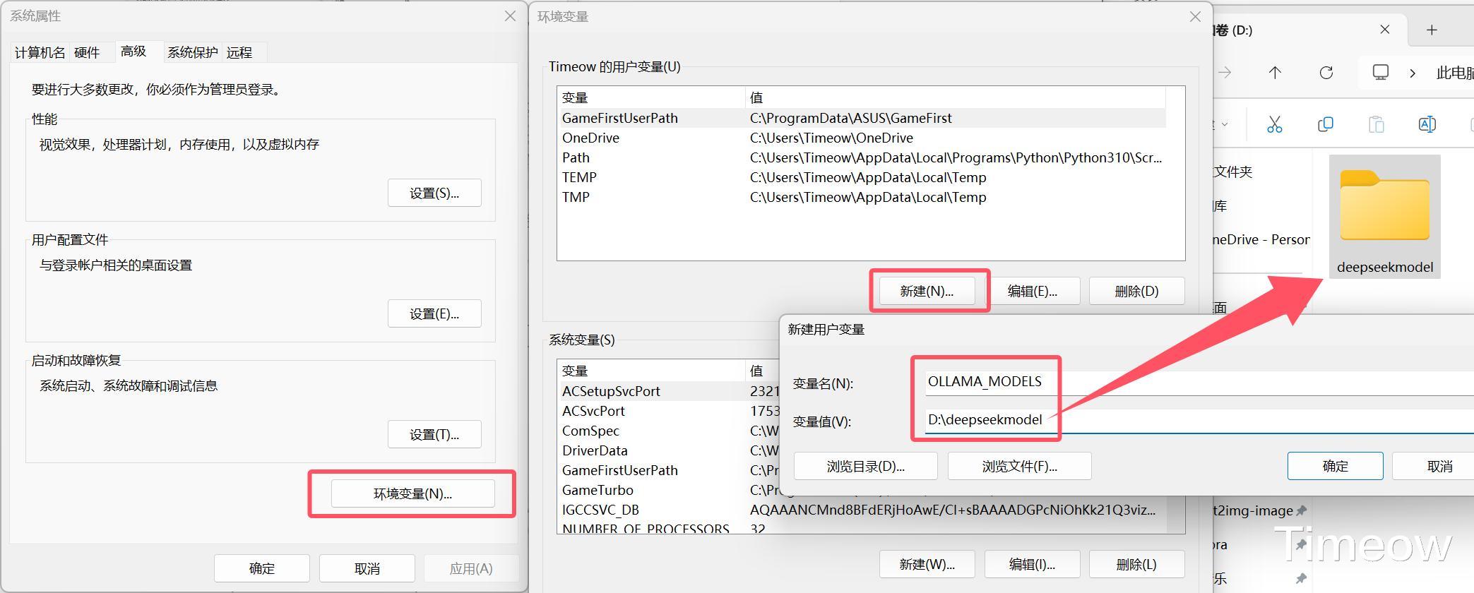 windows搜索框内输入查看高级系统设置,进入环境变量>新建,设定DeepSeek的模型存放位置,并在电脑硬盘目录里新建一个模型目录文件夹(比如我命名为deepseekmodel)。