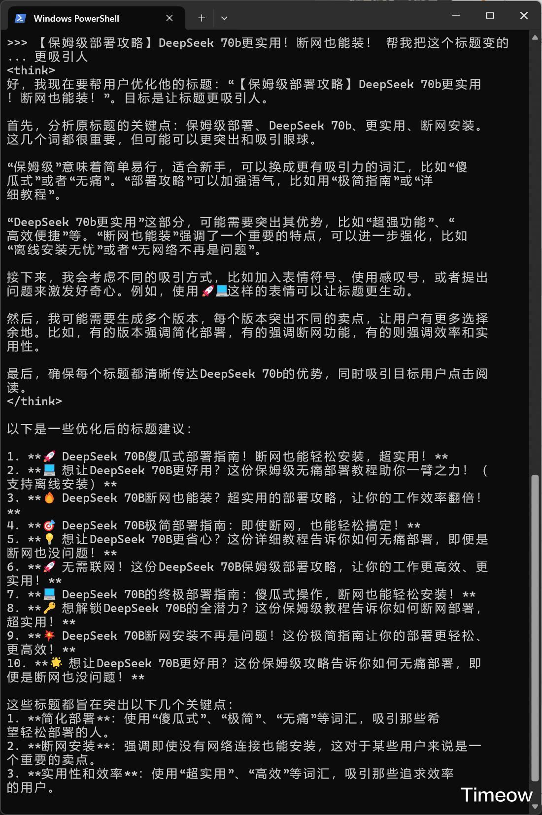 CMD/终端运行DeepSeek经过漫长的等待,70b大模型安装完成后,运行环境和DeepSeek大模型就算搭建好了。我们在cmd/终端里可以直接输入ollama run deepseek-r1:70b命令来使用DeepSeek。