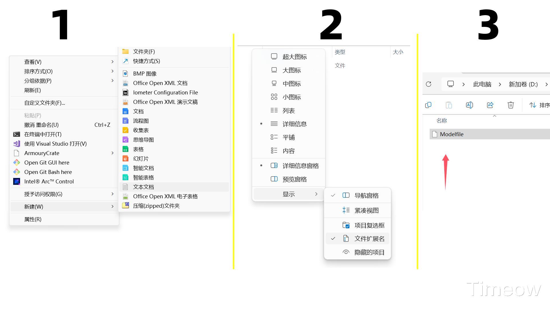 随后在deepseekmodel文件夹内,右键新建一个文本文档(.txt),然后点击查看>开启显示文件扩展名,将这个txt文件的.txt后缀删掉,并命名为Modelfile。
