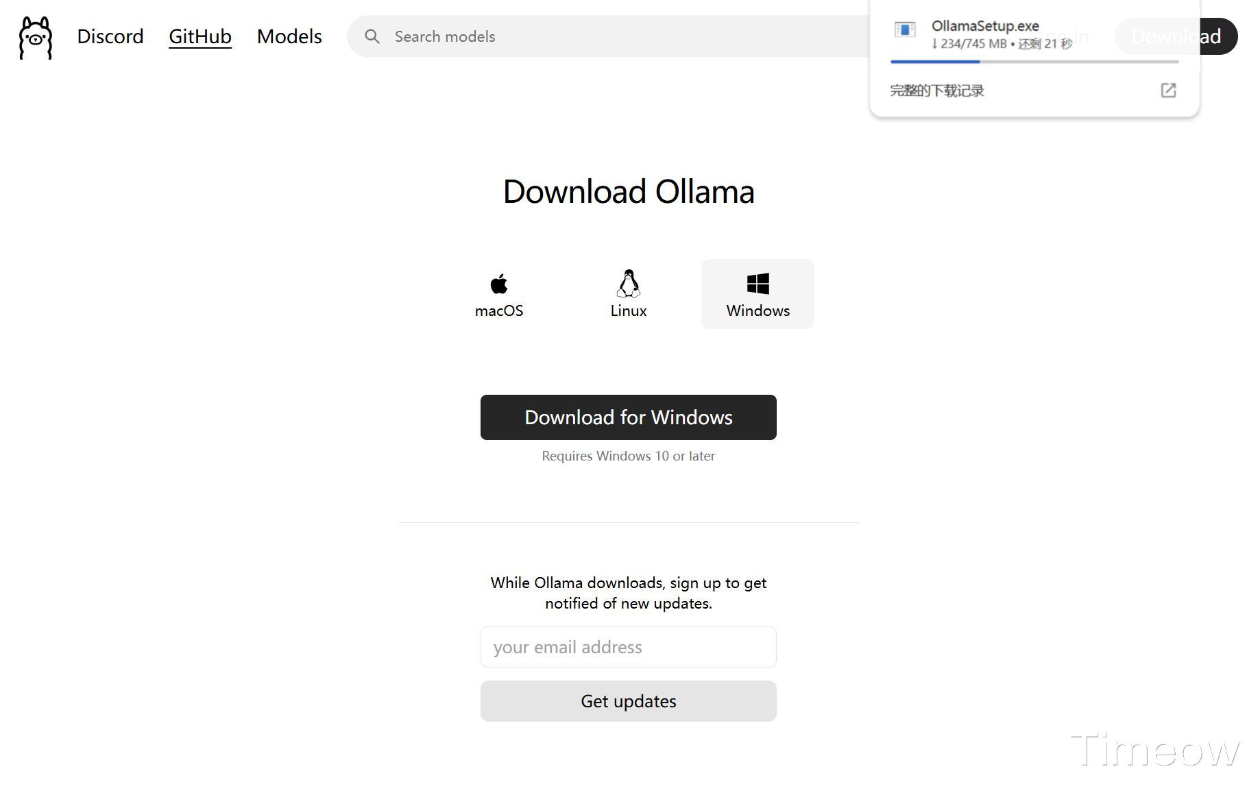 打开Ollama的官网:ollama点com(输入的时候将“点”换成“.”,没有双引号,下同),或者去github下载(开源的项目),如果你是Windows的话,就下载Windows的版本并安装。