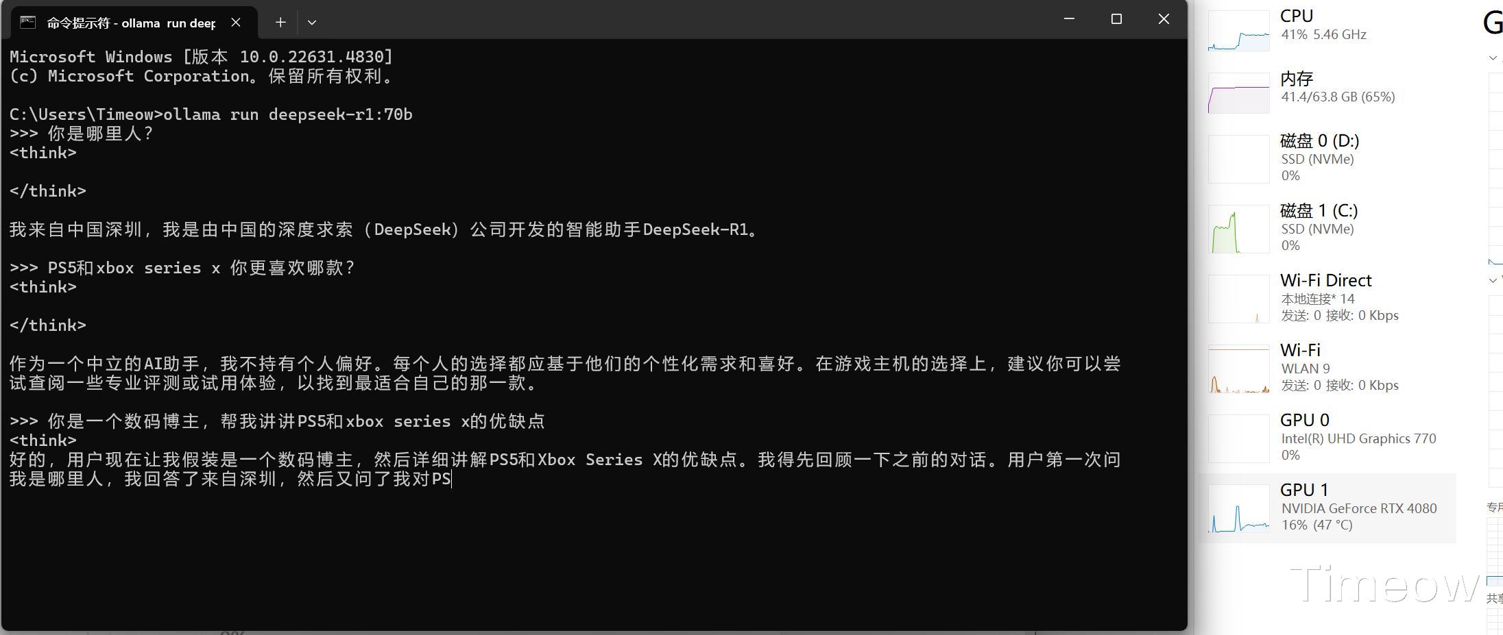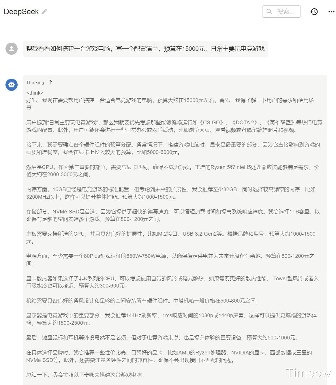 以上的部署操作过程其实非常简单,小白跟着做,绝对可以完成。而70b的DeepSeek大模型已经可以很好进行思考推理生成了,如果不考虑时效性的内容(如上图中,DeepSeek对电脑硬件的了解可能还停留在2年前,但思路是对的),本地部署70b完全可用!
