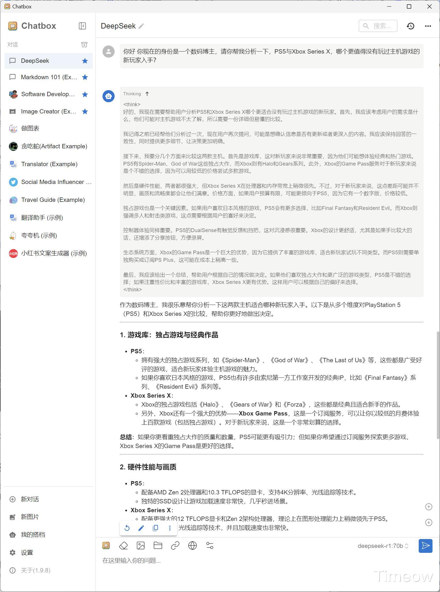 接下来就是愉快的使用过程了,对话过程中,我们也能和在线版一样,可以看到DeepSeek的思考推理过程,我的电脑运行时的速度大约是每秒2个token(2个汉字或2个单词),完全可以接受!