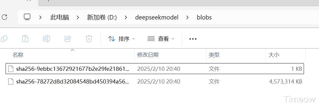 完成后,D:\deepseekmodel\blobs文件夹内就会有这两个文件,大的那个就是模型文件。