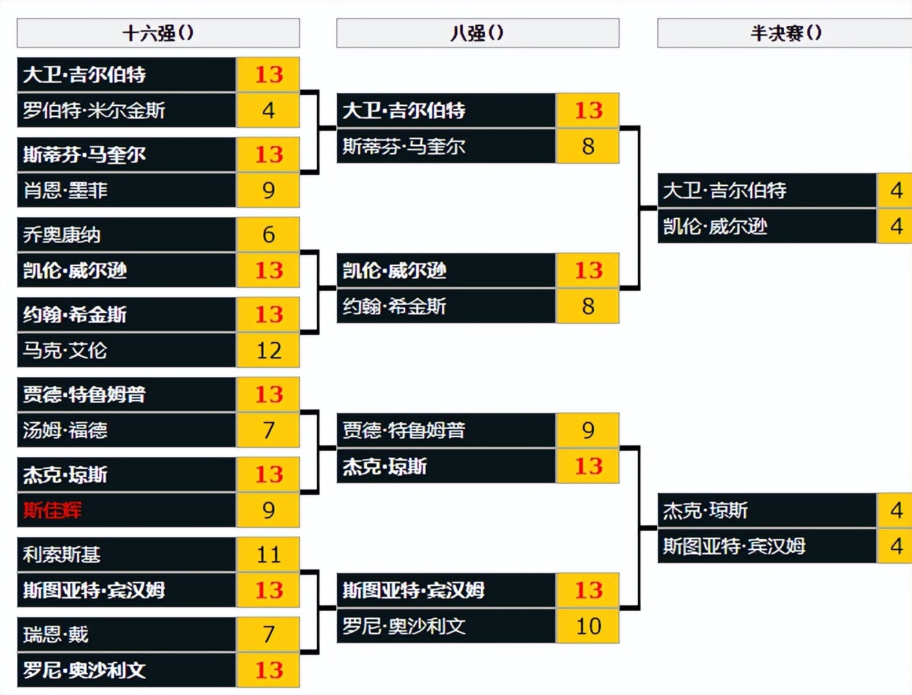 而大卫·吉尔伯特与凯伦·威尔逊目前双方也战平,值得一提的是大卫·吉尔伯特在第4局对凯伦·威尔逊打出单杆104分是目前两场半决赛打出唯一一杆单杆破百。他们每局详细比分如下:[第1局]23-81(73),[第2局]67-13,[第3局]40-87(87),[第4局](104)105-0,[第5局](91)91-41,[第6局]24-74(67),[第7局](74)115-11,[第8局]0-88(88)