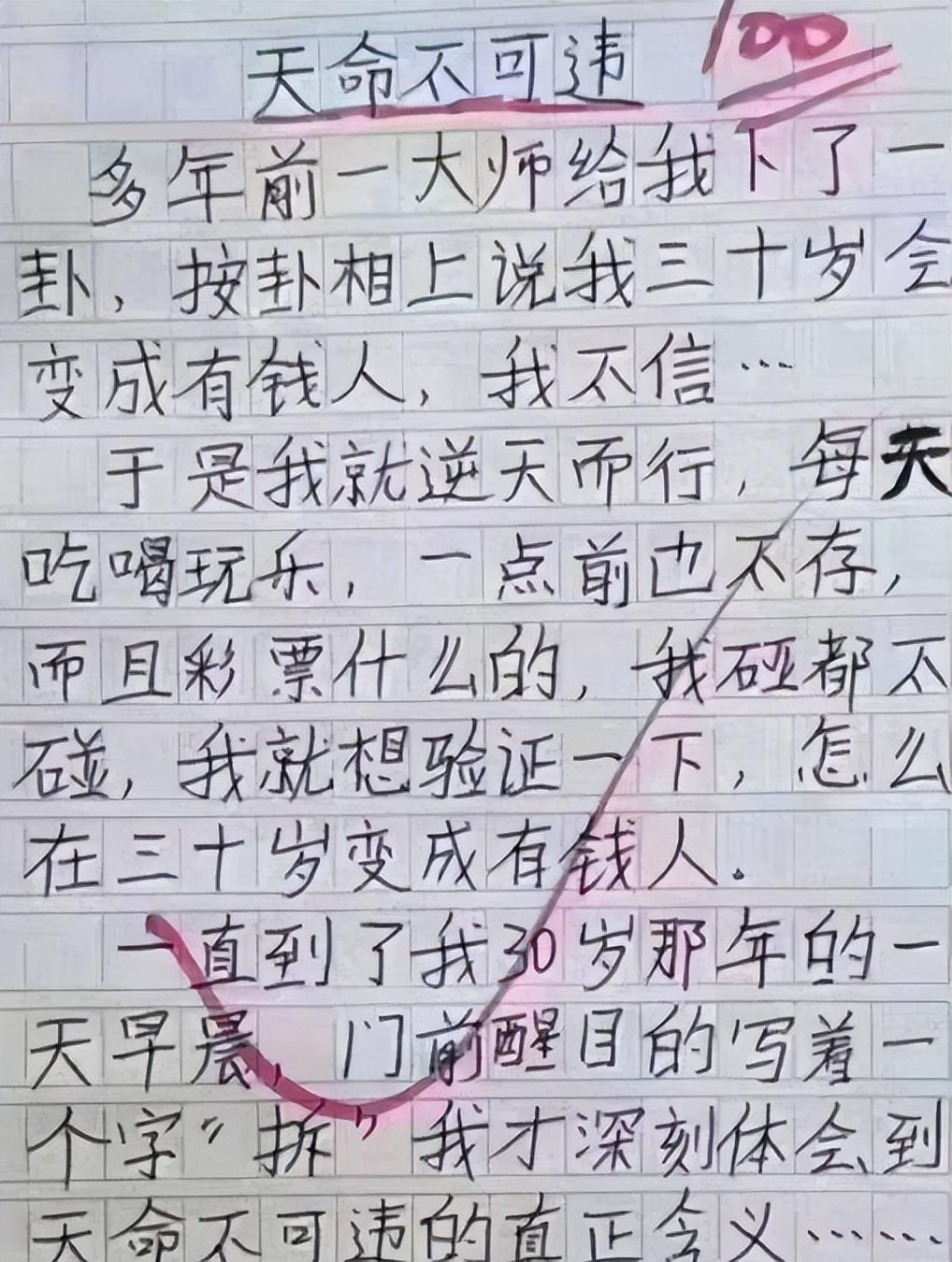 这种劫富济贫的想法,虽然有些天真,但也充满了创意和正义感。老师看完后,也觉得这个理想很不错,给了他满分。