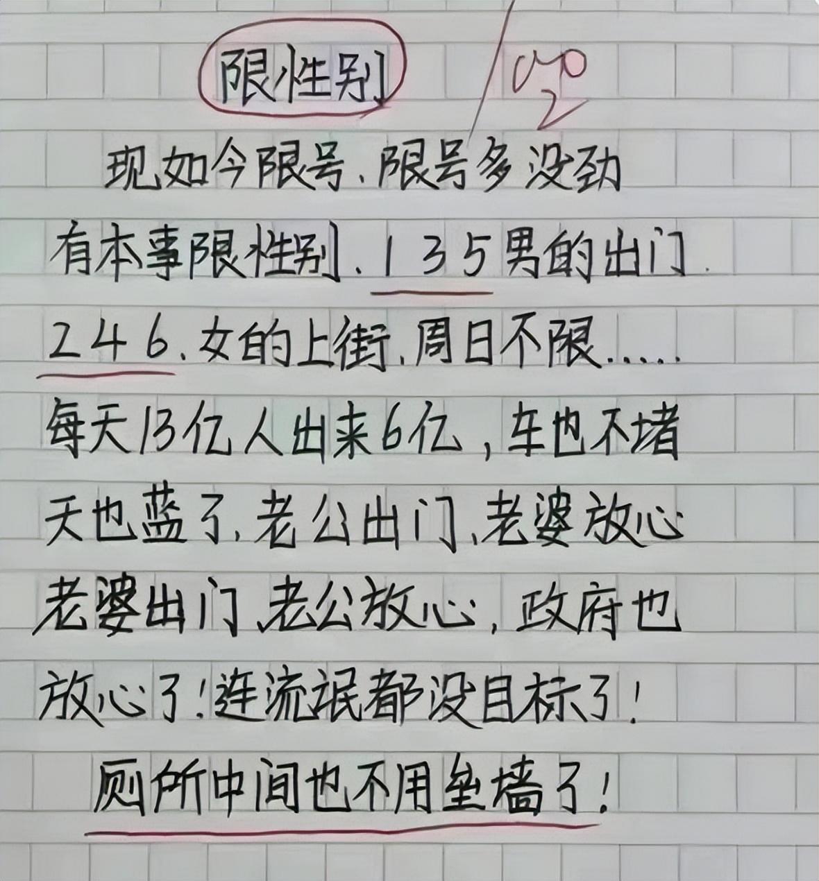 他从大城市限号这件事中,得到了启发,创作了一篇名为《限性别》的作文。