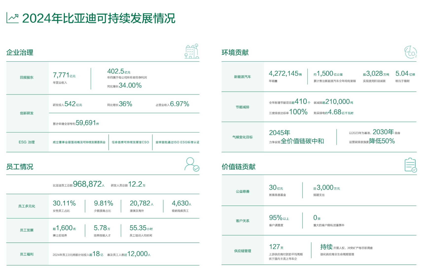 这样简单了解以后再回头看比亚迪发布的2024年ESG可持续发展报告,比亚迪作为新能源汽车领域的领军企业,贯彻的理念是“科技,绿色,明天”,其发布的2024年ESG可持续发展报告,不仅展现了其在环境、社会及治理方面的卓越成就,更彰显了比亚迪以技术创新为核心驱动力,在可持续发展道路上的坚定步伐。