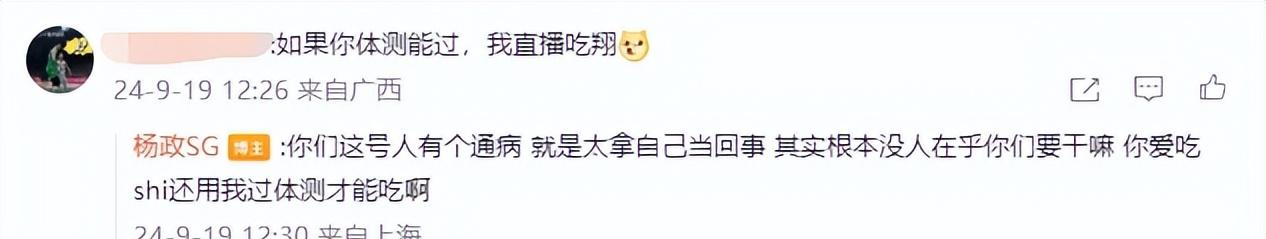 这场舌战愈演愈烈,双方各执一词,互不相让。杨政指责贾磊像营销号一样炒作,而贾磊则认为杨政过于敏感。就在这时,一位网友的“惊天言论”让这场风波再起波澜。这位网友声称,如果杨政能过体测,他直播吃翔。杨政对此回应道:“你们这号人总是太拿自己当回事,其实根本没人在乎你们要干嘛。”