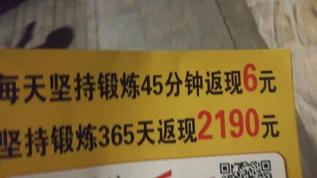 本想赶紧拒绝离开,但看到宣传单上写着:“每天坚持锻炼45分钟返现6元,坚持锻炼365天返现2190元。”不禁好奇问道年费多少。李君说:“年费1680元。”