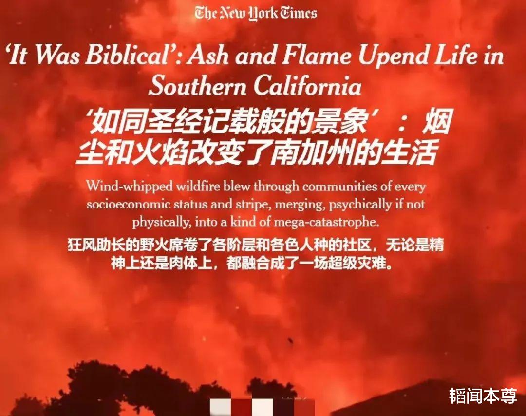 美媒惊呼加州山火“如同圣经记载般的景象:烟尘和火焰改变了加州的生活”,狂风助长的野火席卷了各阶层和各色人种的社区,无论是精神上还肉体上,都融合成了一场超级灾难。