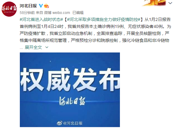 河北省进入战时状态 根据国务院联防联控机制关于局部聚集性应对处置工作要求, 河北省立即进入战时状态 ,组织省、市、县(区)三级流行病学调查人员,对所有核酸检测阳性人员及其密切接触者进行现场流行病学调查, 全面查清行踪轨迹,排查密切接触者和密切接触者的密切接触者,全部进行集中隔离,采取隔离措施并进行核酸检测。 同时,全面组织开展消杀,全力开展医疗救治,不惜代价救治患者。