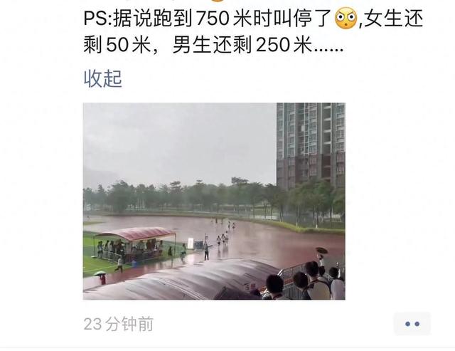 4月18日11时10分左右,中考体育考试南沙广附考点,广州外国语学校正在进行第三项的中长跑项目考试,当本组16名考生准备起跑时,雨势很小,考点综合研判可继续考试,发令起跑出发一圈后,降雨及风势突然增大,裁判员立即叫停召回本组考生,并转移至安全场所,提供毛巾、热水、午餐、暖气及更衣室等保障措施。
