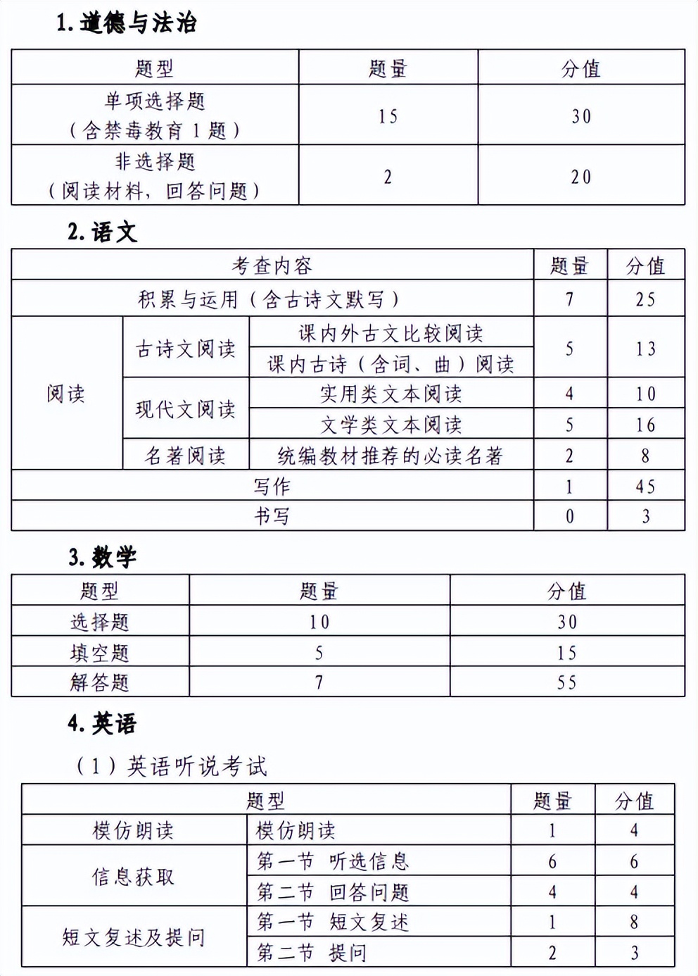 各科目题型与分值情况:注:2024年深圳中考试卷命题通知未发布,现有最近可参考的是2023年相关安排。