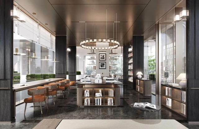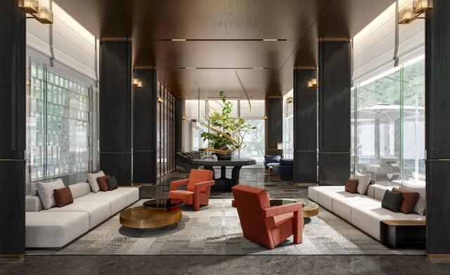 约66m展示面的社区大门,映衬居住者的眼界与格局。从酒店式落客区进入,穿过仪式门廊空间,来到精奢酒店大堂,尊崇感瞬间拉升到新高度。