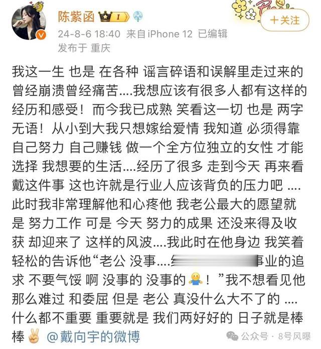 在戴向宇发文不久,陈紫函也赶来回应此事:“老公,真没什么大不了的...什么都不重要,重要的就是我们俩好好的,日子就是棒棒。”