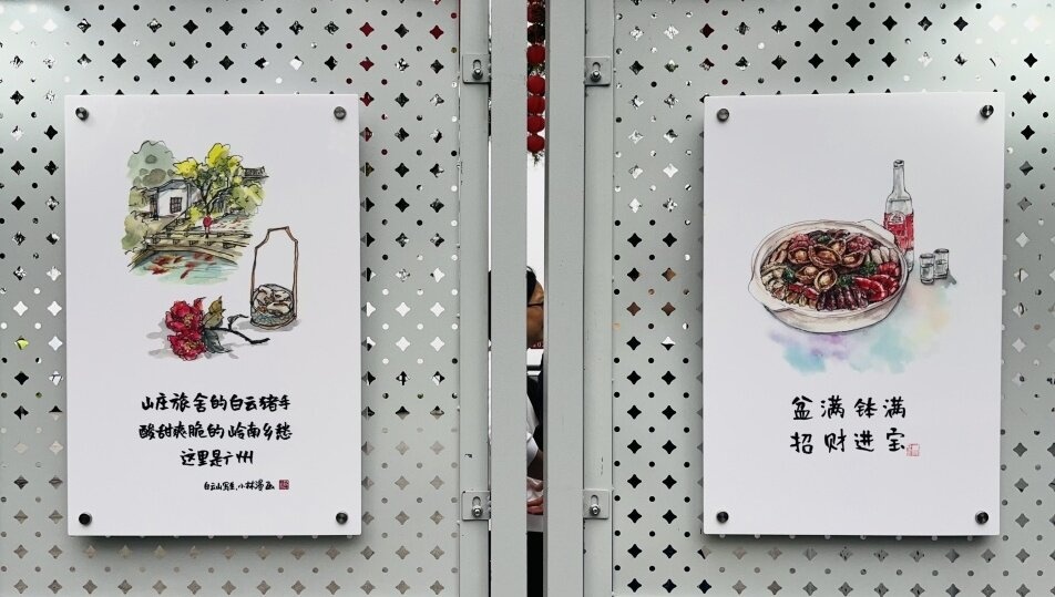 小林老师在创作过程中深入白云山的自然与人文地标,描绘了帽峰山、白云湖等自然景观,勾画了白云国际机场、广州白云站、广州国际港等国际枢纽,还打卡了三元古庙、石井桥等历史地标,并将太和烧鸡、龙岗黄皮等白云美食融入画作。在轻盈透亮的亚克力板上,小林老师以细腻的笔触勾勒出葱郁的山林美景,搭配发人深省的幽默语言,营造出自然又富有哲理的艺术氛围,形成了一道道独特的风景线。