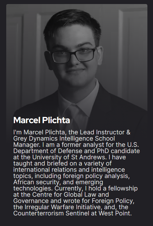 值得注意的是,“灰色动力”公司在官网上自称是一家“致力于使情报‘民主化’”的公司,并且其“首席讲师”和“情报学院经理”并不避讳在个人介绍中展示他曾担任美国国防部分析师的职业背景。