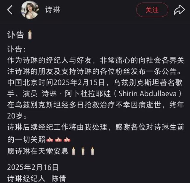 在2025年2月15日,歌手诗琳突然去世,年仅20岁。