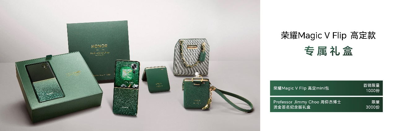 荣耀首次与国际时尚大师Professor Jimmy Choo周仰杰博士合作,推出荣耀Magic V Flip 高定款。高定款以水晶与祖母绿为主元素,通过微米级水晶闪镀工艺再现水晶华彩。专门打造的腕表主题,将奢华屏幕显示与时尚梦幻外观完美融合,让用户尽享一体式璀璨高定之美。