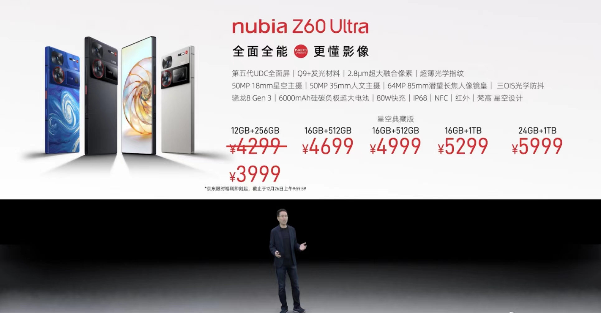 努比亚Z60 Ultra的首发价格是12+256GB版本3999元、16+512GB版本4699元、16+512GB(典藏星空版)4999元、16+1TB版本5299元。
