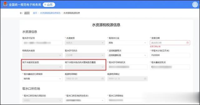 遇到此类问题,请您打开“水资源税信息报告”模块,点击“修改”按钮,查看“地下水超采区类型、地下水取水地点供水管网是否覆盖”项是否填写完整,未选择填写的,请重新操作后进行保存。进行申报时,系统会根据修改后的信息,自动配置带出本期适用税率,并重新计算税款,您可确认税款无误后再进行申报。