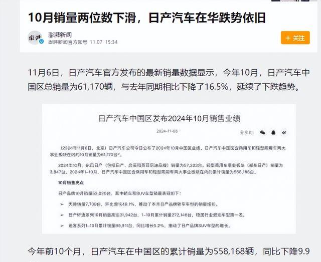 澎湃新闻——10月销量两位数下滑,日产汽车在华跌势依旧