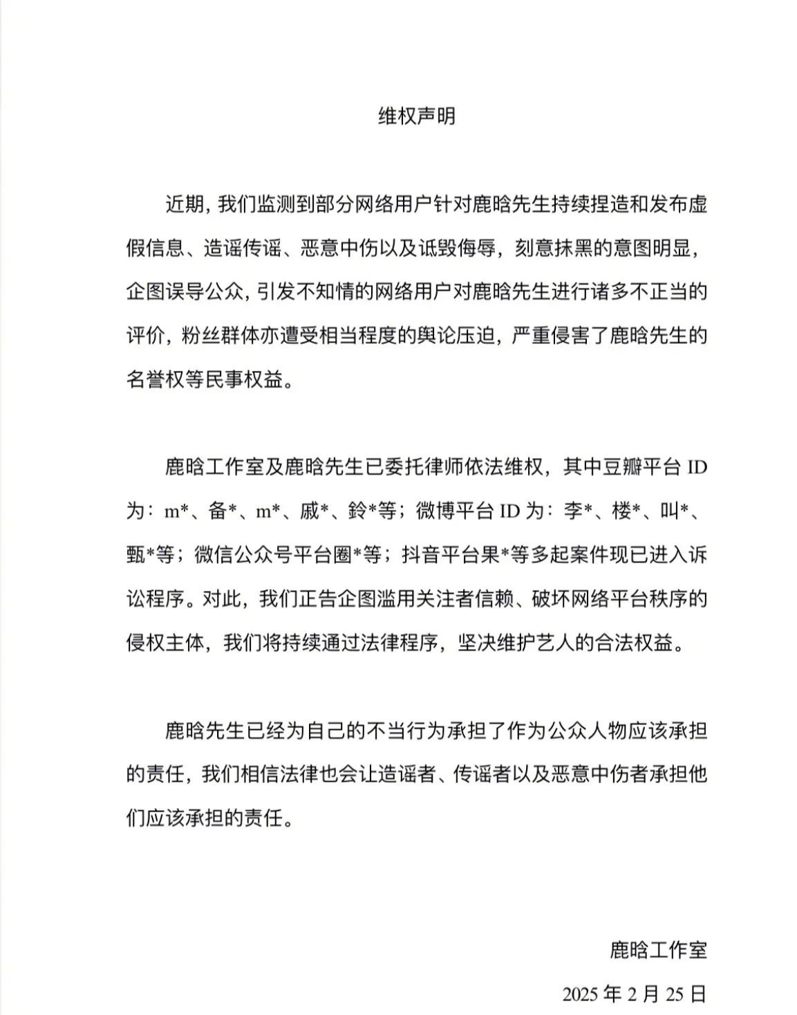 鹿晗工作室通过微博账号发布声明,称近日检测到网上有大量关注鹿晗的谣言和恶意中伤的信息,这种行为误导了公众,引发了对鹿晗的不正当评价,目前工作室已经委托律师收集取证,对相关ID账号发起了诉讼。