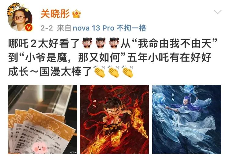 关晓彤这边近期微博更新,是晒她到电影院看哪吒。