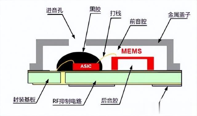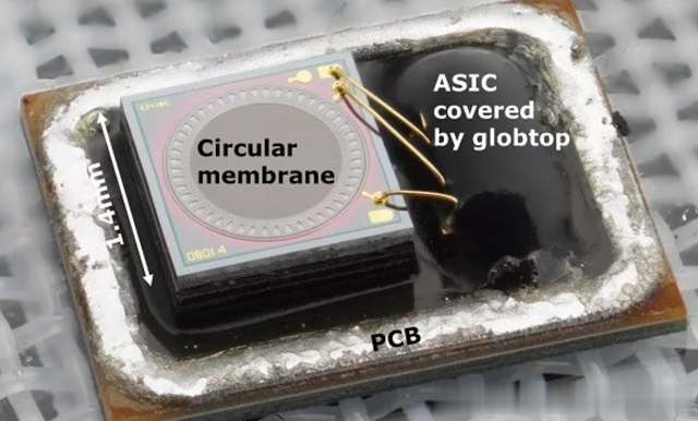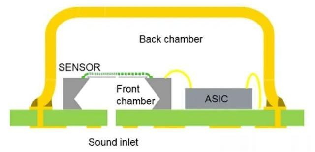 麦克风元件及其电路不在同一硅芯片上。他们的制造技术差异太大,无法将它们制造在一起。相反,麦克风和单独的 ASIC(专用集成电路)组合在同一个封装中,通过引线键合连接,如下图所示。