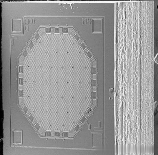 硅制造是在严格控制的环境中,利用一系列沉积和蚀刻工艺,产生金属和多晶硅的形状集合以形成MEMS麦克风。生产MEMS麦克风涉及到的几何结构是微米(μm)级。声波所经过的背板中的孔直径可以小于10 μm,薄膜厚度可以是1 μm左右。薄膜与背板之间的间隙仅有数微米。图2所示为典型MEMS麦克风传感器元件的SEM图像,从顶部(薄膜)观看。图3所示为该麦克风元件中部的截面图。在该设计中,声波通过元件底部的空腔进入麦克风,并穿过背板孔以激励薄膜。