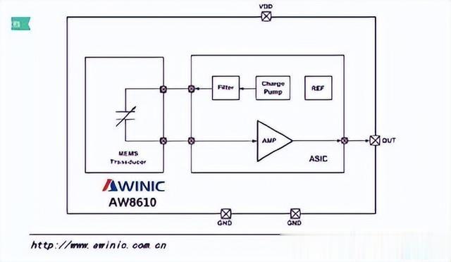 ASIC中的电荷泵装置会提供一个稳定的直流偏置电压给振膜。当电容值发生变化时,这个变化的电容值会转化为微弱的电压变化量,形成输出信号。这个微弱的电压变化量经过ASIC后级的放大电路进行放大处理,最终将模拟音频信号转换成数字信号,生成脉冲密度调制(PDM)输出。
