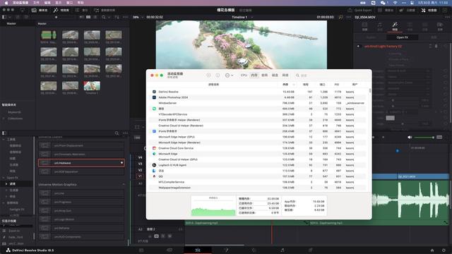 虽然购买的是M1pro 8+14核,不过性能并没有影响日常使用,修图剪辑都可以流畅进行。不过由于Mac OS系统原因,很多达芬奇或者PS插件的兼容性确实不好,要转译使用。或者就是像V5插件等达芬奇降噪插件直接不支持MAC系统。