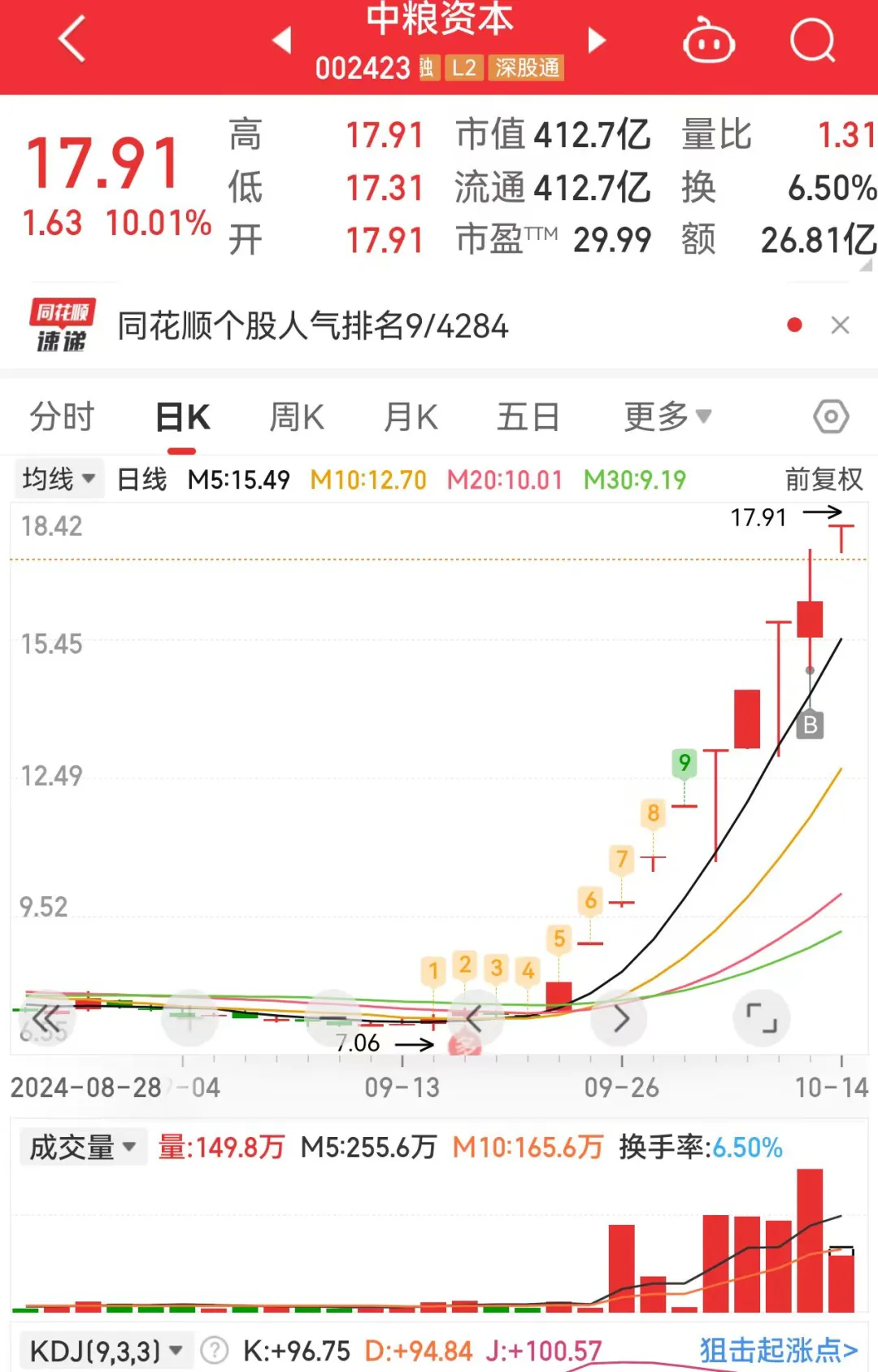 2、中粮资本,早上抢一字板后面加单就没排了,当时小商品城、中油资本和四方精创都比较恶劣,炸板回封也没加仓。