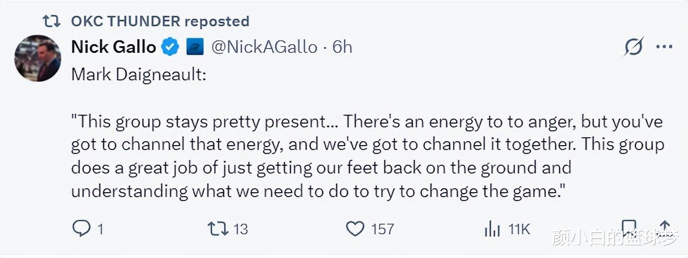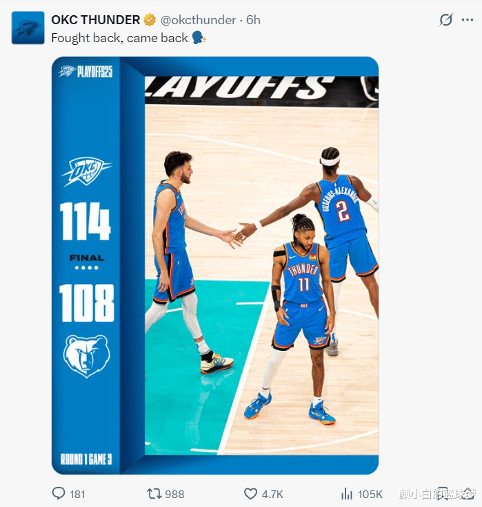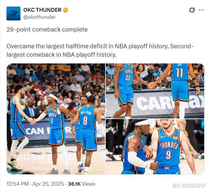 雷霆队官方庆祝球队完成了季后赛史上第二大的逆转分差29分,仅次于19年快船逆转勇士的31分,这也是雷霆队史季后赛最大逆转分差,全队别提有多么高兴了。