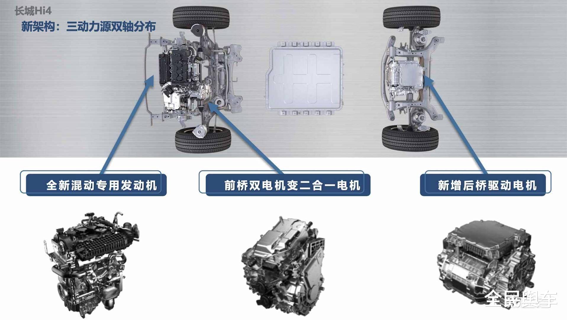 有所不同的是,长城这套Hi4混动系统,仅仅在前桥布置了一个电机,既可发电又可驱动,再配合上后桥的电机,以此来实现双电机四驱,相比较一般插电式混合动力车型少一个电机负担,这也是长城这套Hi4混动系统最大的不同点。