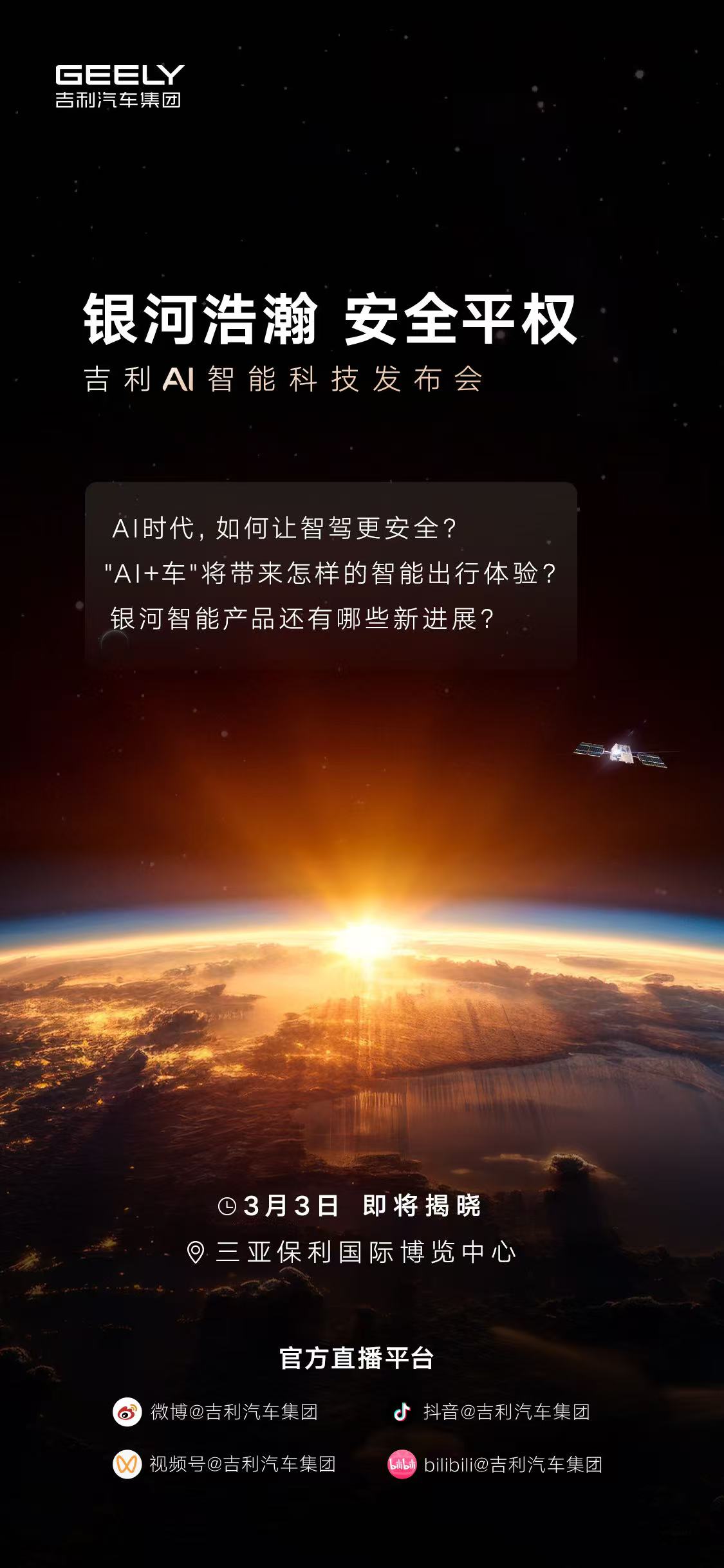从吉利官方消息得知,3月3日,吉利AI智能科技发布会即将盛大开幕!本次发布会将聚焦AI+车 的深度融合,从“被动安全”到“主动守护”的跨越式升级,吉利始终以技术实力为每一位用户保驾护航。