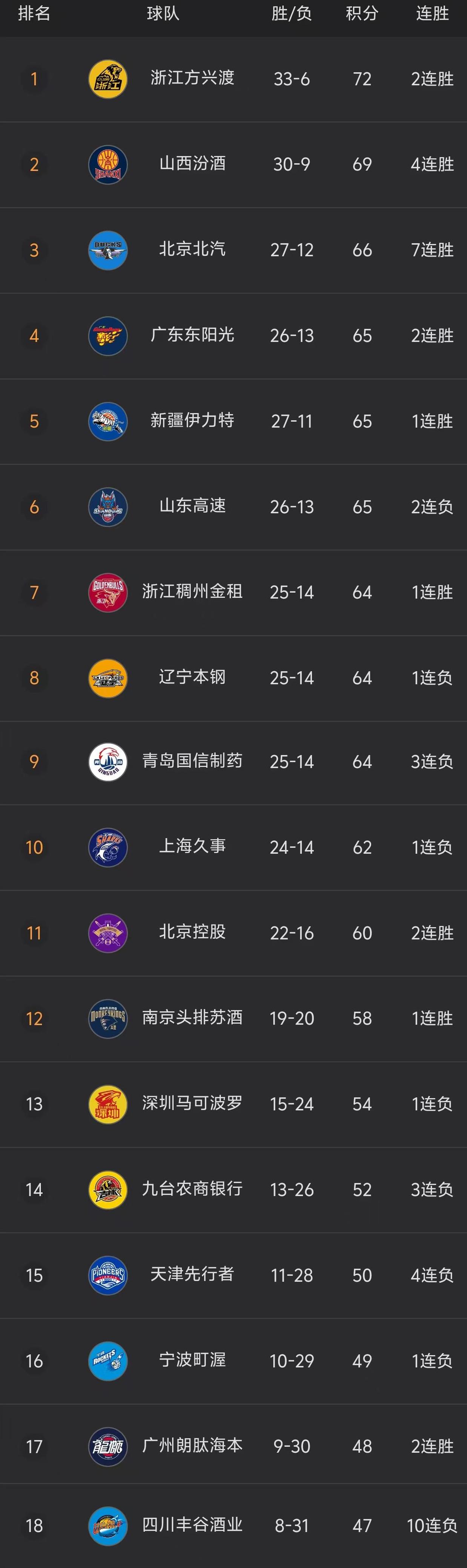 积分榜的排名出来了啊,广厦队33胜6负,还是稳坐积分榜头把交椅。山西队最近赢了山东队那场比赛特别惊险,现在战绩是30胜9负。要说这个赛季谁能跟广厦争常规赛冠军啊,估计也就山西队有点希望,别的队伍嘛,就别太指望了。