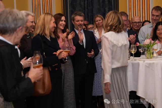 1.30 丹麦国王腓特烈十世、王后玛丽和二公主本尼迪克特出席王室老员工(白衣女士,干了17年的王室信息经理Lene Balleby) 的送别会