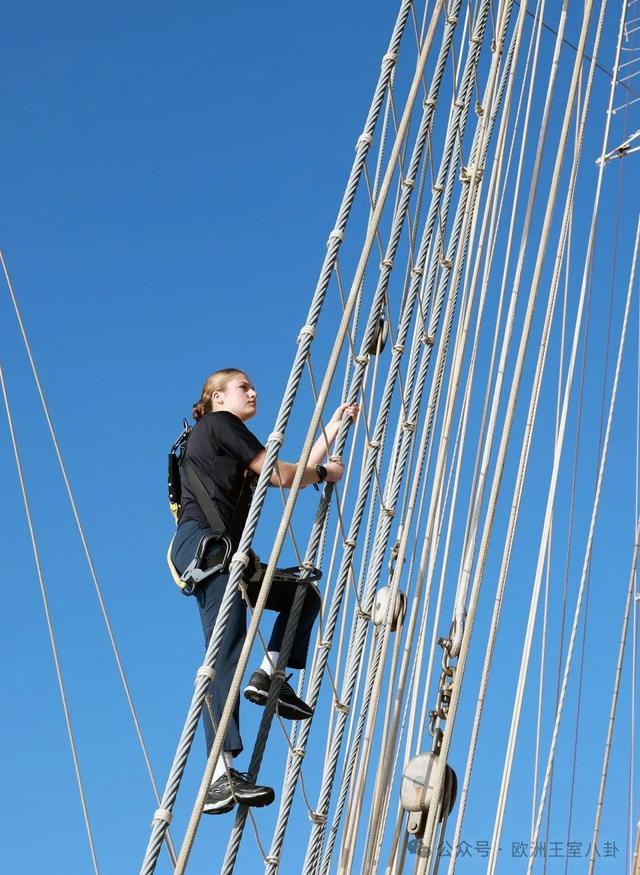 本周,西班牙王室公布了莱昂诺尔公主在海军训练舰胡安·塞巴斯蒂安·德·埃尔卡诺号的训练日常。摄影师为了出片估计也爬上桅杆了