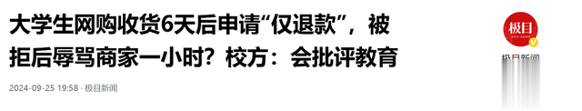 极目新闻 《大学生网购收货6天后申请“仅退款”,被拒后辱骂商家一小时?校方:会批评教育》2024-09-25