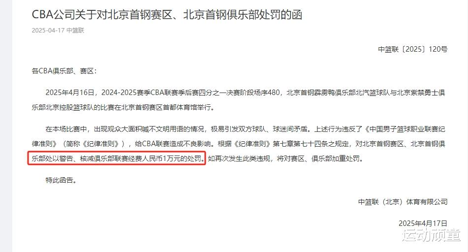 CBA1/4决赛展开激烈争夺,就在16日的第二轮比赛中,山西主场和北京主场均出现了严重的违规现象,山西主场球迷谩骂广东队员,还向场内投掷水杯,而北京主场也出现观众大面积喊不文明用语。为打击违规乱象,CBA公司深夜12点开出重磅罚单,严厉处罚山西队、北京队和北控队,广东队还有三人遭到罚款,并对山西队进行史上最严厉的警告,若再次出现类似严重问题,将予以从重处罚,包括采取无观众空场比赛、更换主场、主场改为客场进行的处罚。