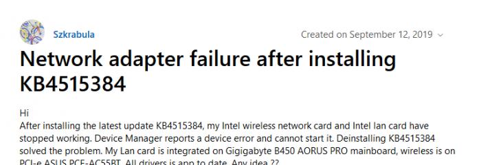 累积更新(kb4515384)导致NIC无法启用,错误代码为10。从英特尔或者WindowsUpdate源上重新安装网络驱动并不能解决这个问题。不过通过“程序&软件”面板移除该更新或者使用恢复点回滚至此前版本就解决了这个问题。