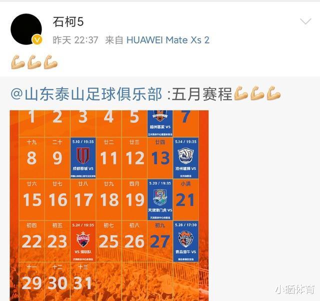 再次关注泰山队一条新闻,最近媒体以及自媒体报道了泰山队另一名中后卫队员被抓走调查的事情,甚至还有人一针见血地指出这个人是石柯,接下来的5月2日晚上,石柯自己也在社交平局台上公布了泰山队5月的赛程安排,并配上一篇文章加油以打破谣言。下边的粉丝们还纷纷给石柯打气。