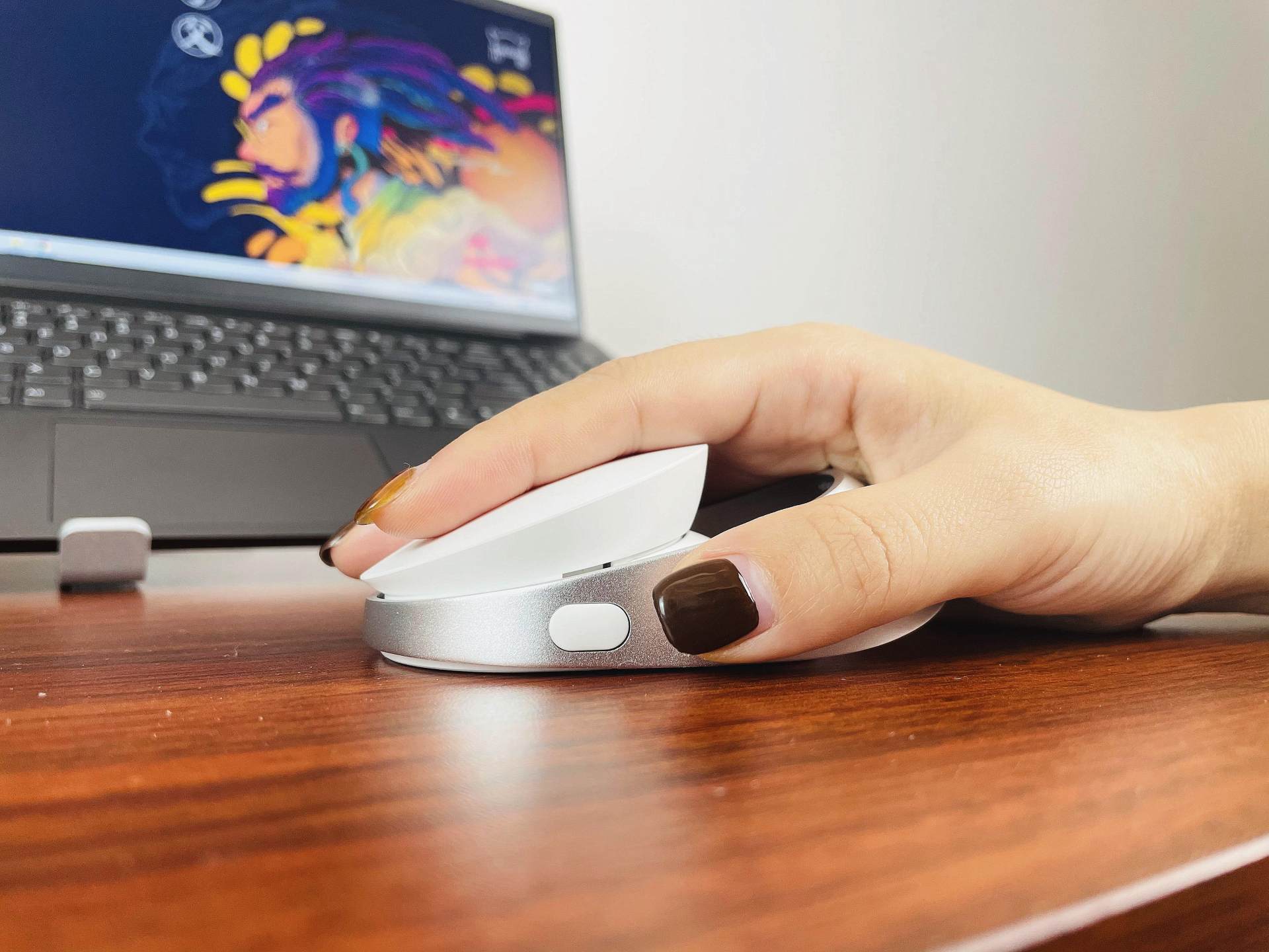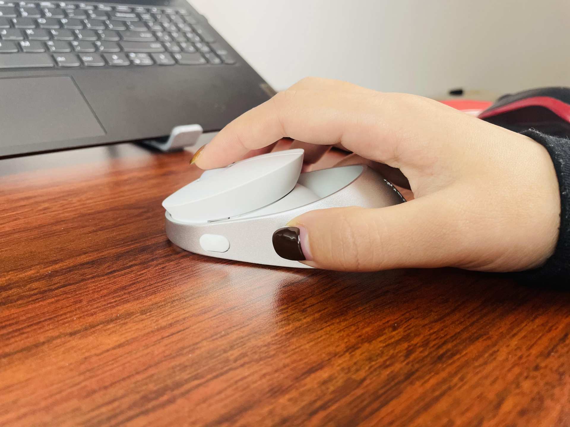 ▼雷柏Ralemo Air 1的定位是年轻女性,所以它的大小也是按照女性手掌的大小量身定做,可以看到LD达人使用时刚刚好,尾部的金属手托正好托住手掌。对比我和LD的握持,可以看到对于手大的男性用户来讲,鼠标的尺寸就有些捉襟见肘