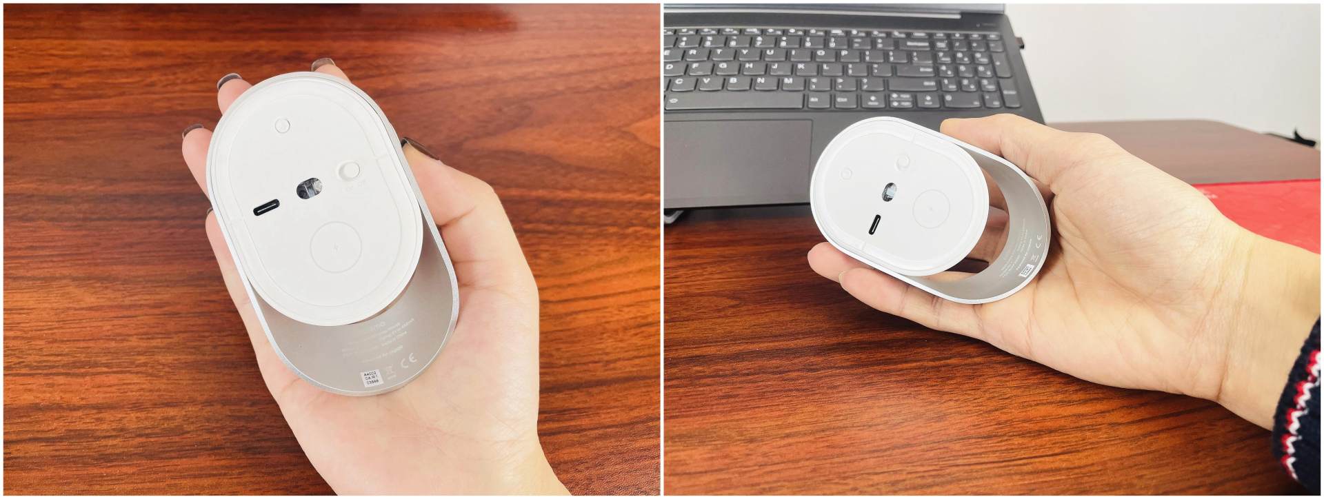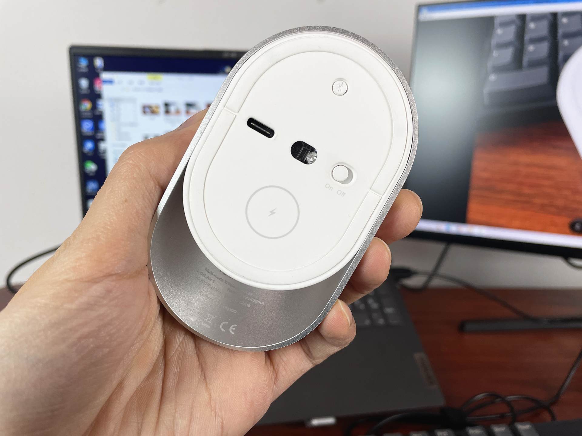 ▼鼠标底部分别有蓝牙模式切换按钮,type-c充电口和开关按钮以及Qi无线充电感应区